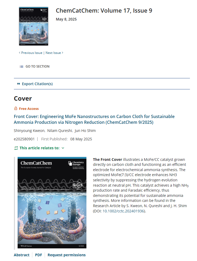The Front Cover illustrates a MoFe/CC catalyst grown directly on carbon cloth and functioning as an efficient electrode for electrochemical ammonia synthesis. The optimized MoFe(7:3)/CC electrode enhances NH3 selectivity by suppressing the hydrogen evolution reaction at neutral pH. This catalyst achieves a high NH3 production rate and Faradaic efficiency, thus demonstrating its potential for sustainable ammonia synthesis. More information can be found in the Research Article by S. Kweon, N. Qureshi and J. H. Shim (DOI: 10.1002/cctc.202401936).
