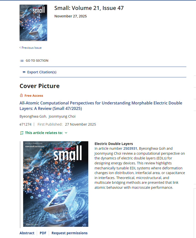 In article number 2503931, Byeonghwa Goh and Joonmyung Choi review a computational perspective on the dynamics of electric double layers (EDLs) for designing energy devices. This review highlights mechanically tunable EDL systems where deformation changes ion distribution, interfacial area, or capacitance in interfaces. Theoretical, microstructural, and multiscale bridging methods are presented that link atomic behaviour with macroscale performance.