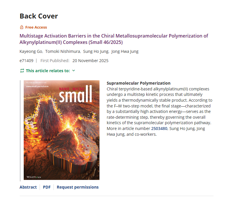 Chiral terpyridine-based alkynylplatinum(II) complexes undergo a multistep kinetic process that ultimately yields a thermodynamically stable product. According to the F–W two-step model, the final stage—characterized by a substantially high activation energy—serves as the rate-determining step, thereby governing the overall kinetics of the supramolecular polymerization pathway. More in article number 2503480, Sung Ho Jung, Jong Hwa Jung, and co-workers.