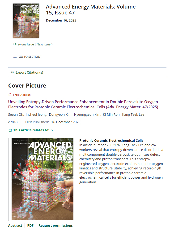 In article number 2503176, Kang Taek Lee and co-workers reveal that entropy-driven lattice disorder in a multicomponent double perovskite optimizes defect chemistry and proton transport. This entropy-engineered oxygen electrode exhibits superior oxygen kinetics and structural stability, achieving record-high reversible performance in protonic ceramic electrochemical cells for efficient power and hydrogen generation..